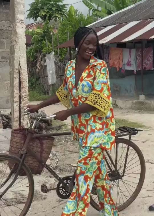 The Brezza Lae Shirt is a vibrant celebration of summer, crafted in slinky fabric with a striking retro-inspired floral print in citrus orange, aqua and lime. Designed with a relaxed, oversized silhouette, this statement resort shirt features wide sleeves finished with intricate crochet lace cuffs, adding a touch of artisanal detail to its bold energy.